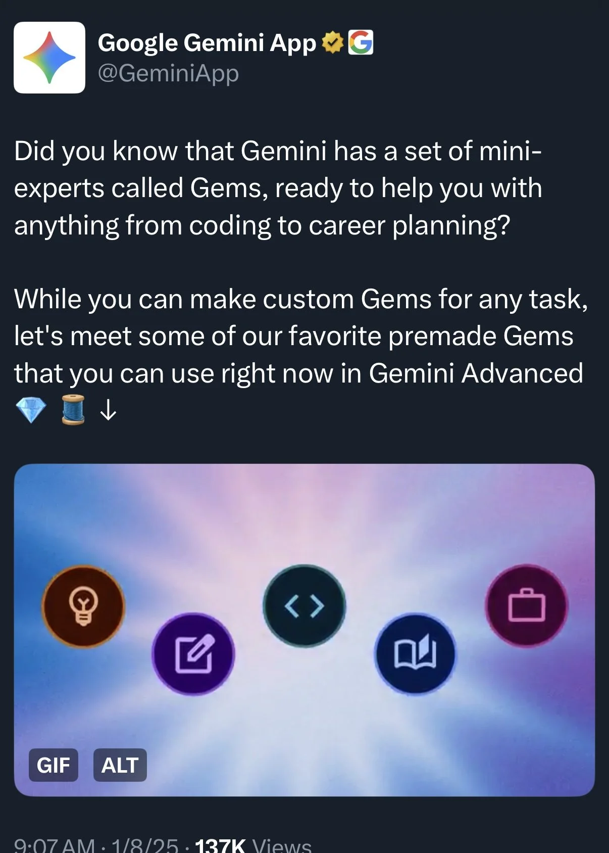 Threaded post providing a deep dive breakdown of a key Gemini feature, Gems
